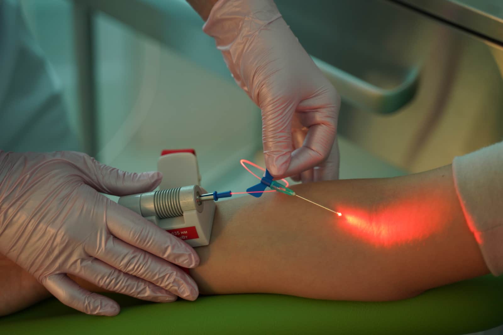 Для выполнения процедуры мы используем оптический волновод, который подключается к источнику низкочастотного лазерного излучения вводится в вену.